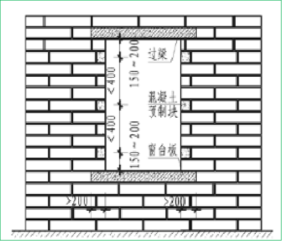 【防治措施】明確以建筑圖紙尺寸預(yù)留洞口,加強砌筑過程中的尺寸控制,對大砌塊最好采用掛雙線的方法進行施工;應(yīng)先澆筑窗臺板再砌筑上部墻體,保證窗臺板密實,窗臺板深入墻體不低于120mm。