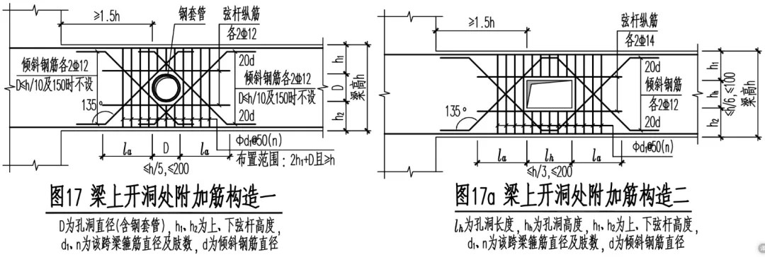 梁上開(kāi)洞,因?yàn)楦淖兞肆菏芰μ匦?,因此必?/span>采用附加筋補(bǔ)強(qiáng)措施,設(shè)計(jì)進(jìn)行力學(xué)計(jì)算后出具大樣圖,嚴(yán)格依圖施工。某項(xiàng)目水管和風(fēng)管穿梁開(kāi)洞構(gòu)造示意圖: